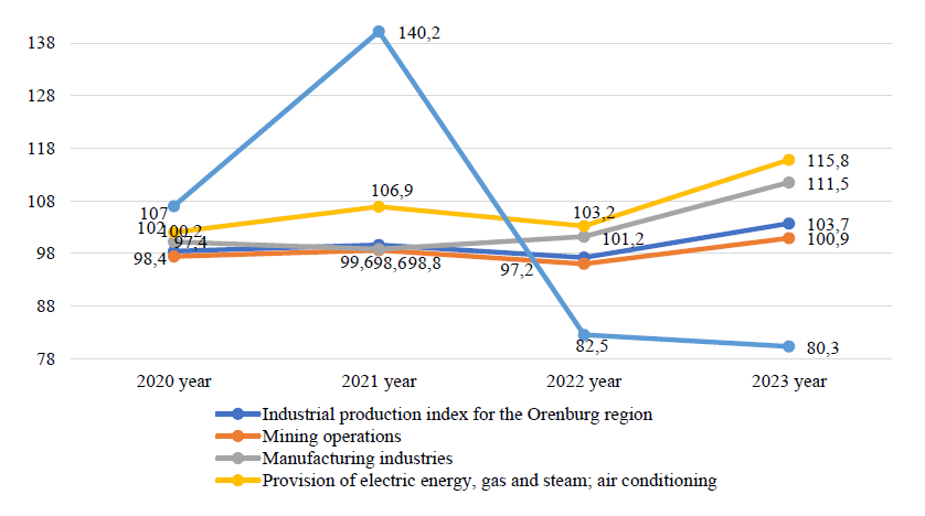 An analysis of the dynamics of industrial production indices in the context of the main types of economic activity in the Orenburg region shows that during the analyzed period there has been an unstable dynamic of the overall industrial production index. Following a decline between 2020 and 2022 (98.4%, 99.6% and 97.2% respectively), there was an increase to 103.7% in 2023. This recovery trend indicates the industrial sector's recovery after a period of stagnation. The mining index shows pronounced negative dynamics in 2022 (96%), followed by a recovery to 100.9% in 2023, suggesting an unstable trend. The manufacturing indices show the most stable positive dynamics among all sectors. After a slight decrease to 98.8% in 2021, there was a moderate increase to 101.1% in 2022, followed by a significant acceleration to 111.5% in 2023. The trend is now one of steady growth. The energy sector index shows sustainable development and indicates the growing electricity consumption from other industries and the population. The trend is one of stable growth. As for water supply and waste disposal, there is an extremely unstable trend with a sharp increase in 2021 (140.2%) and a subsequent significant decline in 2022-2023 (82.5% and 80.3%, respectively). It's a crisis trend. The analysis of the dynamics of industrial production indices revealed the multidirectional dynamics of industrial development in the Orenburg region.