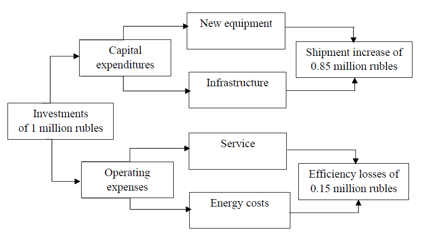 The mechanism of transformation of investments into the final economic result is divided into two main areas – capital expenditures directed to new equipment and infrastructure, which directly contributes to the increase in shipments, and operating costs that go to maintenance and energy needs, creating efficiency losses [Makarov M.A., 2025].
