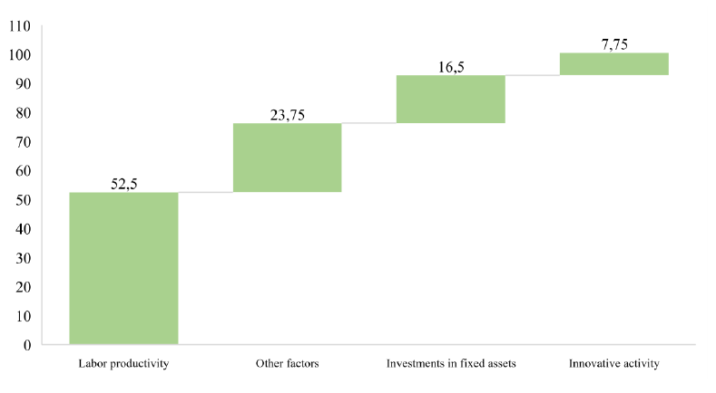 Innovation activity is the least significant factor, which is caused by the time lag between investments in innovations and their commercialization, high risks of innovation projects and insufficient efficiency of innovation process management.