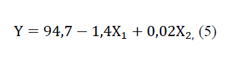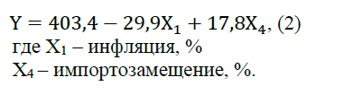 Полученное уравнение 2 демонстрирует, что высокая инфляция отрицательно влияет на банкострахование, а активное импортозамещение положительно. Свободный член (403,4) представляет среднее значение объёма банкострахования при нулевых значениях всех рассматриваемых факторов. Если инфляция увеличивается на 1%, то объем банкострахования снижается на 29,9 единиц. Каждое дополнительное процентное изменение в политике импортозамещения увеличивает объёмы банкострахования примерно на 17,8 миллиардов рублей. Уравнение статистически значимо, так как выполняется требования F-критерия Фишера. Связь между факторами сильная. Ошибка аппроксимации незначительная.