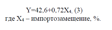 Результаты корреляционно – регрессионного анализа представлены в таблице 1. В качестве зависимой переменной представлен Y - объем банкострахования, млрд. руб., независимые переменные X1 - инфляция, %; X2 - ключевая ставка, %; X3 - темп роста ВВП, %; X4 - импортозамещение, %; X5 - индекс глобализации, баллы. Анализ многофакторной регрессионной модели произведенный в Microsoft Excel показал следующие результаты: зависимость объема банкострахования от инфляции и импортозамещения.