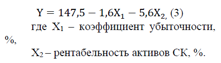 Уравнение статистически значимо и соответствует правилам проведения корреляционно – регрессионного анализа. Высокие коэффициенты убыточности и рентабельность активов СК негативно будут влиять на объем банкострахования. Чем больше убытков несет страховая компания, тем меньше заинтересованность банков сотрудничать с ней. Высокая прибыльность страховщика может снижать потребность привлекать банковские ресурсы и посредников для продвижения продуктов страхования.