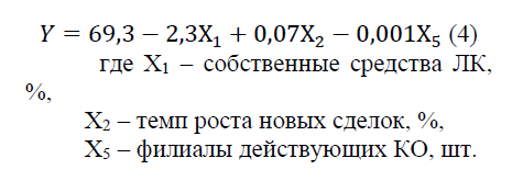 Для оценки влияния микро- факторов на интеграционные отношения банков и лизинговых компаний были определены следующие индикаторы: зависимая переменная Y - доля ЛК связанные с банками, %, независимые переменные - собственные средства ЛК, %, - темп роста новых сделок, %, - достаточность капитала банков Н1.2, %, - рентабельность активов банка, %, - филиалы действующих КО, шт. - рентабельность активов СК, %. Свойство мультиколлиниарности прошли факторы - собственные средства ЛК, %, - темп роста новых сделок, %, - филиалы действующих КО. Построили регрессионную модель интеграционных отношений.