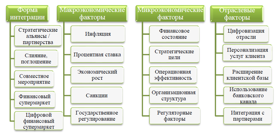 Рис.1. Факторы, влияющие на интеграцию взаимоотношений банков, страховых и лизинговых компаний
