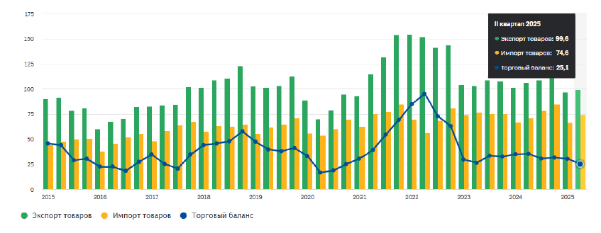 В 2025 году прогнозируется рост общего объема внешнеторгового оборота, рост экспорт прогнозируется на уровне 420 млрд. долларов (на 5%), увеличение импорта с 200 до 210 млрд. долларов (+5%). Экспорт будет оставаться основной опорой экономики, адаптируясь к ограничениям на нефть и нефтепродукты за счёт увеличения поставок в Индию и Китай, диверсифицируя энергетические маршруты и увеличивая рост несырьевого экспорта (минеральные удобрения, зерновые, продукция машиностроительного комплекса и др.). Растущий импорт решает задачу обеспечения внутреннего спроса несмотря на санкции. Сальдо торгового баланса страны на протяжении последних десяти лет оставалось положительным (рис. 4). И несмотря, на то что в «1 квартале 2025 года сальдо торгового баланса сократилось до 25,1 млрд долларов США в результате опережающего роста импорта товаров на