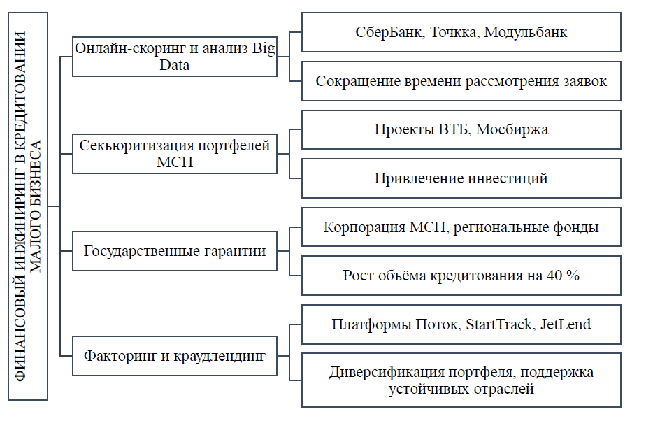 В России внедрение финансового инжиниринга в сектор кредитования малого бизнеса началось после 2014 года в рамках политики импортозамещения и государственной поддержки предпринимательства. Основные направления – цифровизация, создание гарантийных механизмов и применение структурированных кредитных продуктов (Рисунок).