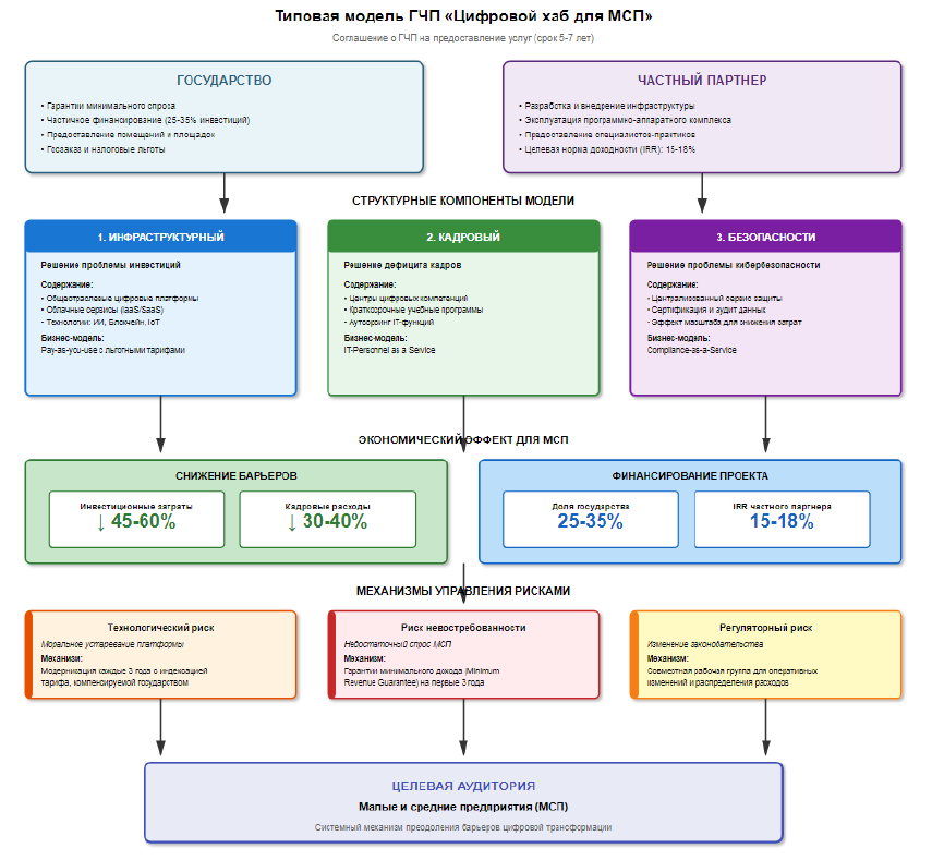 Актуальность исследования обусловлена необходимостью преодоления объективных и системных организационно-экономических барьеров, препятствующих цифровой трансформации малого и среднего предпринимательства (МСП), несмотря на доказанный потенциал технологий искусственного интеллекта (ИИ), блокчейн и интернета вещей (IoT). Предыдущие исследования подтвердили, что ключевыми ограничениями для МСП являются высокие начальные инвестиции и дефицит квалифицированных IT-кадров. Целью работы является разработка и экономическое обоснование типовой модели государственно-частного партнерства (ГЧП), способной обеспечить устойчивый доступ МСП к передовым цифровым активам и компетенциям. Основным результатом исследования является разработка типовой модели ГЧП «Цифровой хаб для МСП», структурированной как сервисное партнерство. Модель интегрирует три ключевых компонента - инфраструктурный (доступ к ИИ/Блокчейн по модели SaaS/PaaS), кадровый (аутсорсинг специалистов через
