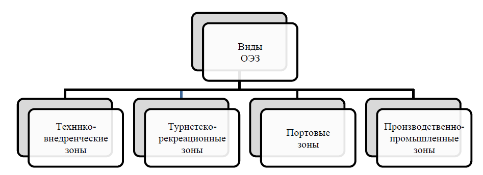 Также практика внедрения особых экономических зон (ОЭЗ) демонстрирует положительный опыт построения государственно-частного партнерства. Эти зоны предлагают бизнесу специальные условия деятельности, сниженные налоги и доступ к государственным ресурсам. Это специально созданные регионы с особым юридическим статусом и льготными условиями ведения предпринимательской деятельности, установленными законом для привлечения инвестиций, развития высокотехнологичных производств, туристско-рекреационного потенциала и стимулирования экономической активности. Эти зоны создаются правительством страны с целью ускорения экономического роста определенных секторов экономики, активизации экспортного потенциала, увеличения занятости населения и повышения конкурентоспособности отечественных товаров и услуг на мировом рынке. Виды особых экономических зон различаются в зависимости от направленности их деятельности (рис. 2).